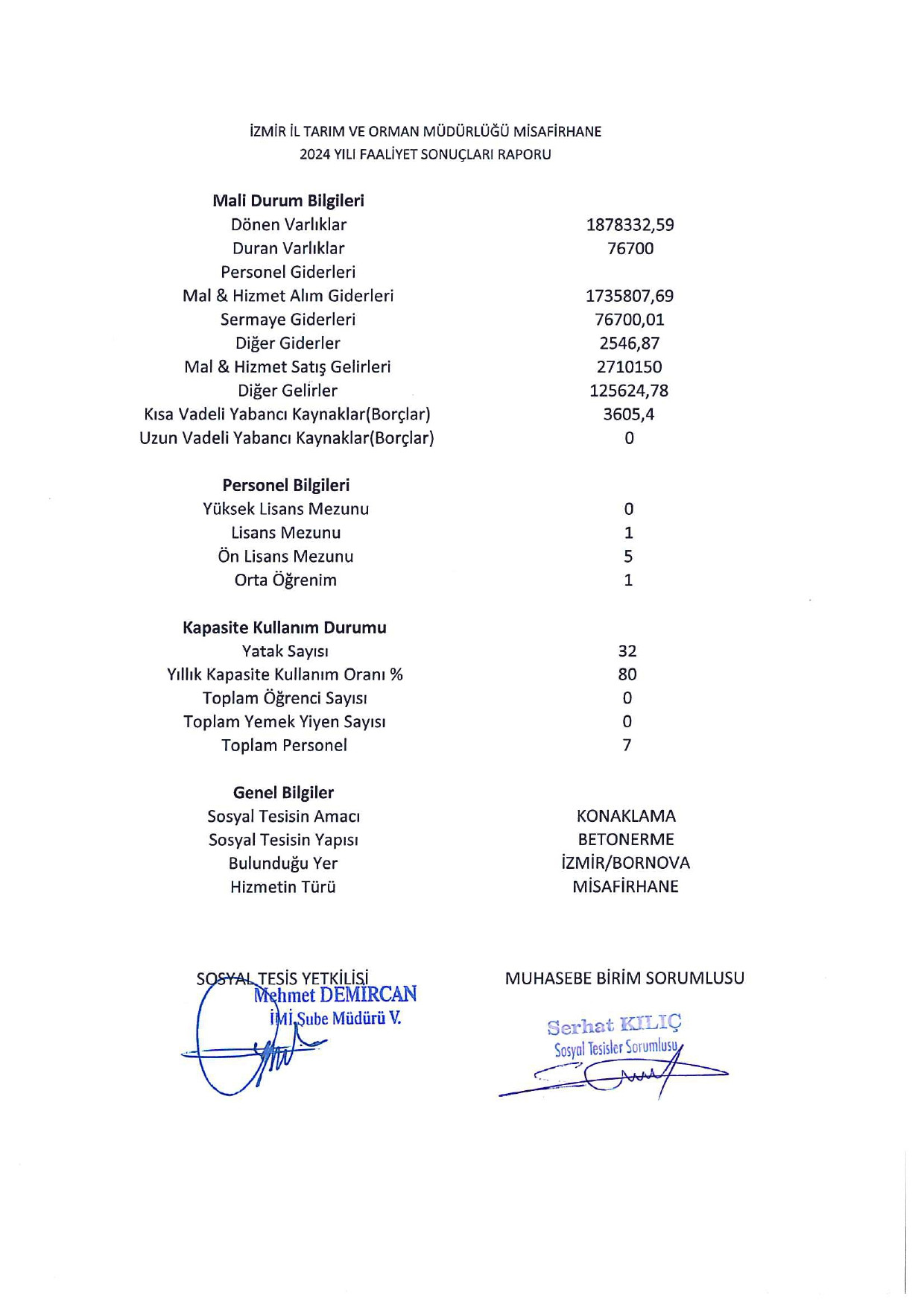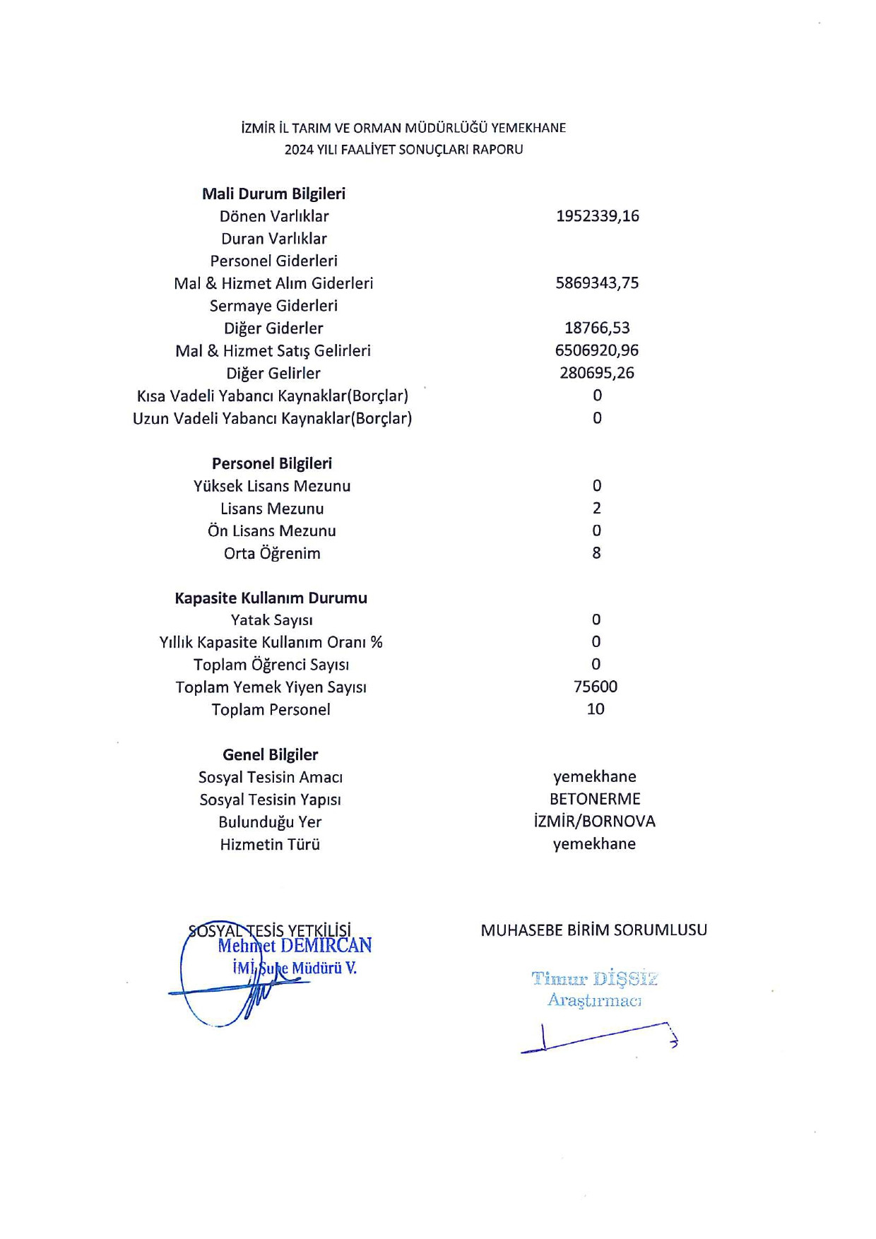 Hem yemekhane hem de misafirhane faaliyet raporları, Sosyal Tesis Yetkilisi Mehmet Demircan tarafından imzalanırken, mali bölümlerin sorumlulukları ilgili birim yetkilileri tarafından onaylandı.