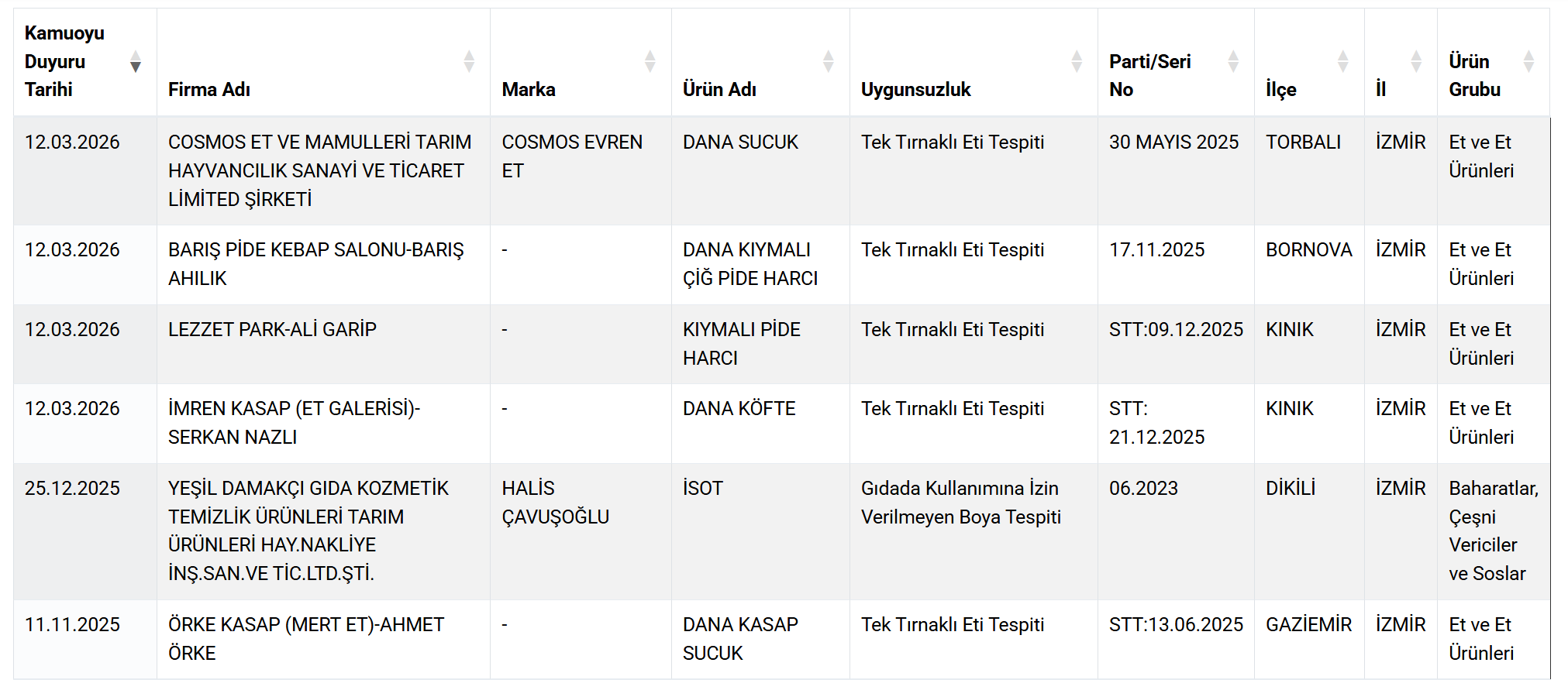 Açıklanan listede yalnızca Torbalı değil, İzmir’in Bornova ve Kınık ilçelerinde faaliyet gösteren bazı işletmelerde de benzer durumlar tespit edildi. Denetimlerde dana eti diye satılan bazı ürünlerde at ve eşek eti bulunduğu bildirildi.